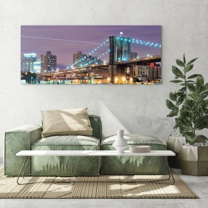 Quadro su vetro - Ponte di Brooklyn di notte con la città illuminata sullo sfondo - 160x50cm - Da tanti anni il ponte di Brooklyn - Decorazione murale moderna per soggiorno e camera da letto ARTTOR