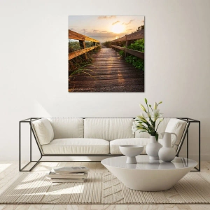 Quadro su vetro - Molo di legno che conduce alla spiaggia al tramonto - 160x50cm - Dritto verso la riva - Decorazione murale moderna per soggiorno e camera da letto ARTTOR
