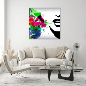 Quadro su vetro - Un'astrazione colorata con un profilo femminile e spruzzi di colore. - 50x70cm - Racconto nei colori dell'arcobaleno - Decorazione murale moderna per soggiorno e camera da letto ARTTOR