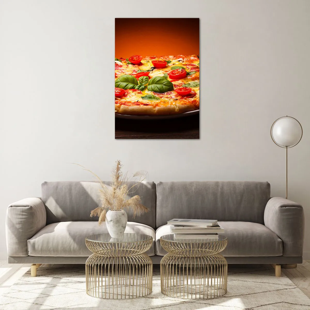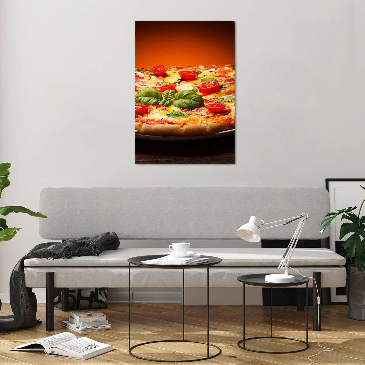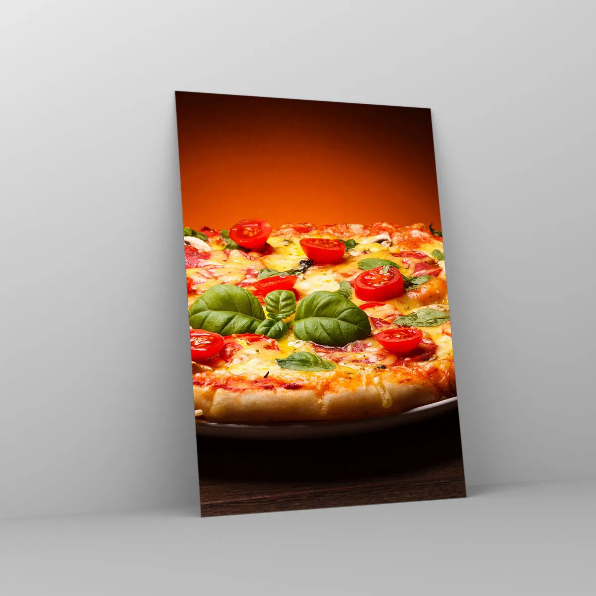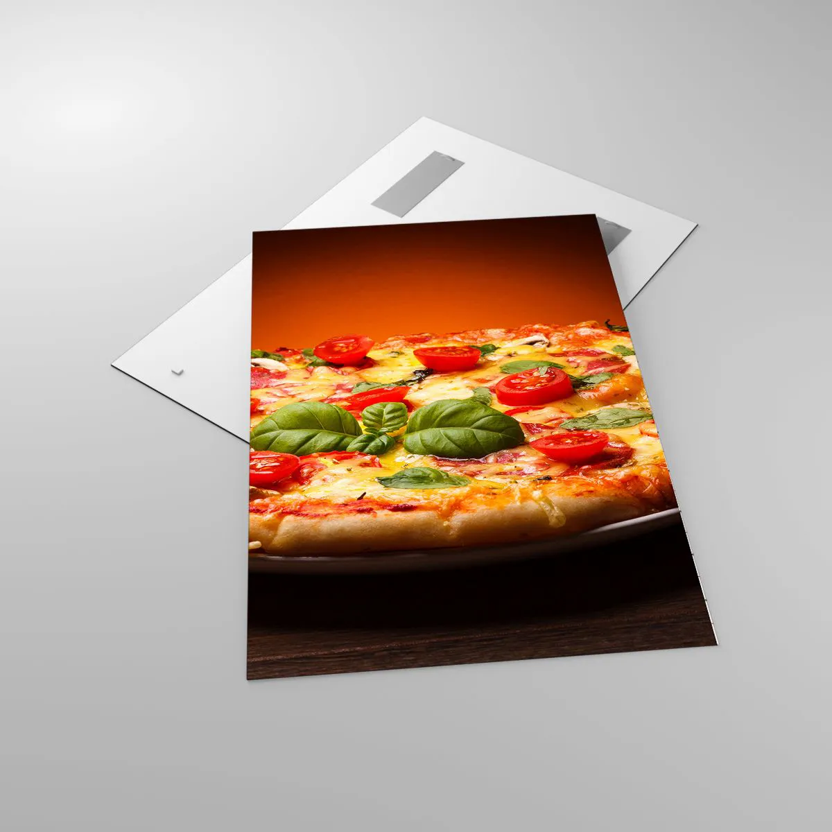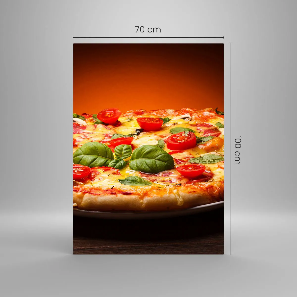 Quadro su vetro - Pizza con pomodori e basilico su un tavolo di legno - 70x100cm - Mamma mia! - Decorazione murale moderna per soggiorno e camera da letto ARTTOR