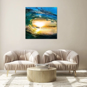 Quadro su vetro - Un'onda dell'oceano catturata alla luce del sole al tramonto - 120x80cm - Nel cristallo oro e smeraldo - Decorazione murale moderna per soggiorno e camera da letto ARTTOR