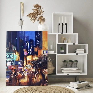 Realizzato in vetro di altissima qualità, questo quadro riproduce perfettamente dettagli come i colori delle insegne al neon, i riflessi dei lampioni e le sagome dei passanti. La superficie in vetro aggiunge profondità ed eleganza, enfatizzando il carattere artistico di questa scena.