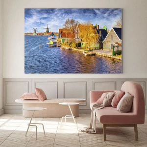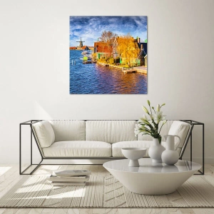 Quadro su vetro - Case pittoresche e mulini a vento in riva all'acqua - 80x120cm - Da secoli immutabile - Decorazione murale moderna per soggiorno e camera da letto ARTTOR