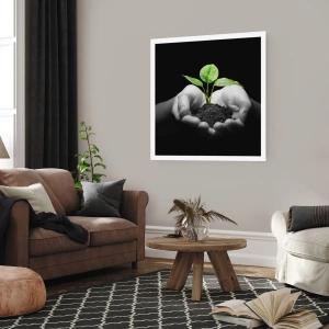 Poster - Mani che tengono una pianta verde su uno sfondo nero - 100x70cm - Amo la natura, la proteggo - Decorazione murale moderna per soggiorno e camera da letto ARTTOR