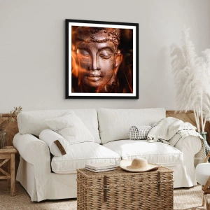 Poster in cornice nera - Una statua del Buddha tra fiamme dai riflessi dorati - 70x50cm - Esiste solo qui e ora - Decorazione murale moderna per soggiorno e camera da letto ARTTOR