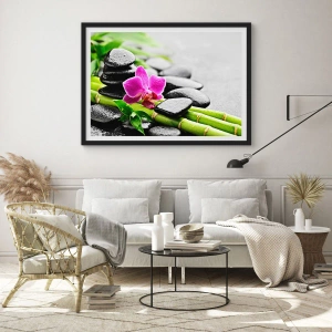Poster in cornice nera - Orchidea viola, pietre nere e bambù in una composizione tranquilla - 70x50cm - Un tranquillo equilibrio - Decorazione murale moderna per soggiorno e camera da letto ARTTOR