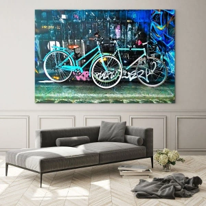 Quadro su vetro - Due biciclette turchesi sullo sfondo di graffiti urbani. - 70x100cm - La città chiama - Decorazione murale moderna per soggiorno e camera da letto ARTTOR