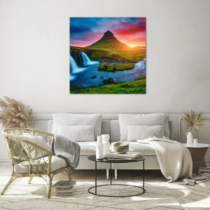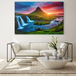 Quadro su vetro - Cascata pittoresca e montagna al tramonto - 70x100cm - Islanda: acqua e fuoco - Decorazione murale moderna per soggiorno e camera da letto ARTTOR