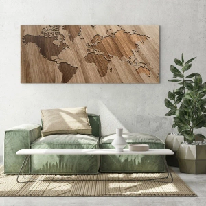 Quadro su vetro - Una mappa del mondo incisa su una superficie di legno - 100x70cm - Il mondo servito a tavola - Decorazione murale moderna per soggiorno e camera da letto ARTTOR