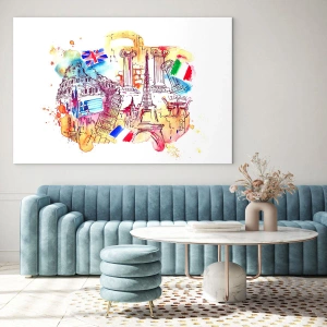 Quadro su vetro - Acquerello di monumenti europei con bandiere nazionali - 70x50cm - Tournée europea - Decorazione murale moderna per soggiorno e camera da letto ARTTOR