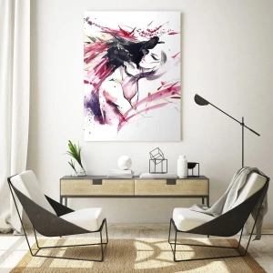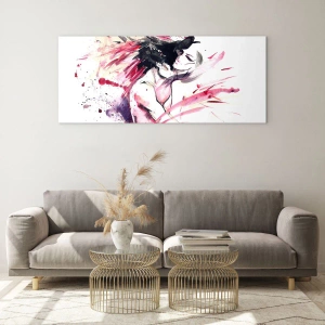 Quadro su vetro - Ritratto astratto di una donna con accenti rossi dinamici - 140x50cm - La pienezza dell'amore - Decorazione murale moderna per soggiorno e camera da letto ARTTOR