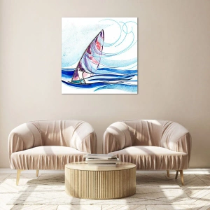 Quadro su vetro - Un surfista cavalca le onde in una composizione astratta ad acquerello - 80x120cm - Con il vento al ritmo delle onde - Decorazione murale moderna per soggiorno e camera da letto ARTTOR