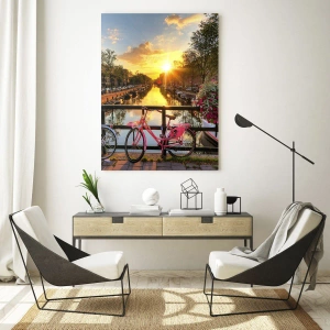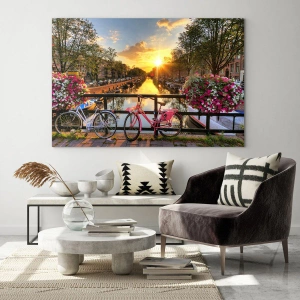 - Un tramonto su un canale di Amsterdam, con biciclette e splendidi fiori sullo sfondo. Una decorazione perfetta per interni ispirati alla città, alla natura e alla tranquillità.