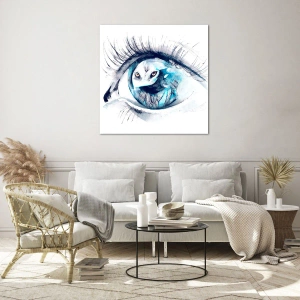 Quadro su vetro - Un occhio con l'immagine di un gufo in tonalità di blu acquerellate - 140x50cm - Faccia a faccia con la natura selvaggia - Decorazione murale moderna per soggiorno e camera da letto ARTTOR