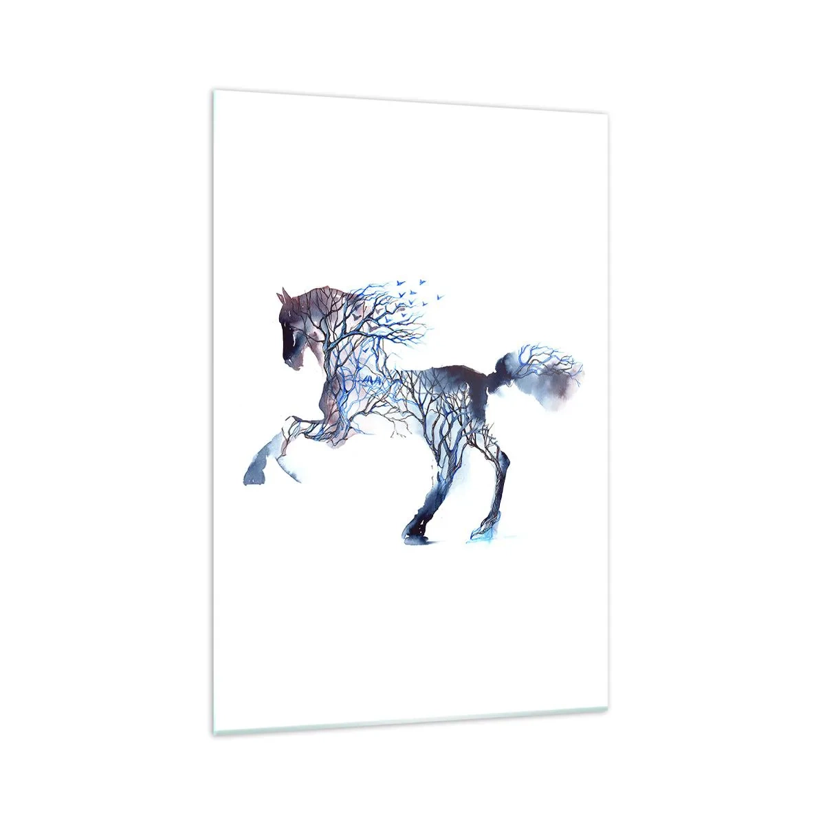 Quadro su vetro - Grafica artistica di un cavallo con motivi di alberi e uccelli - 70x100cm - Come se il bosco si muovesse - Decorazione murale moderna per soggiorno e camera da letto ARTTOR