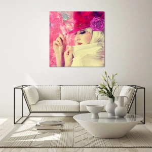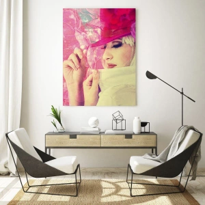 Quadro su vetro - Donna elegante con un cappello rosa con un fiore - 140x50cm - Ritratto retro nei vapori di rosa - Decorazione murale moderna per soggiorno e camera da letto ARTTOR