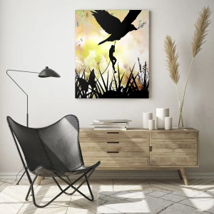Quadro su vetro - Illustrazione di una figura che si arrampica su un uccello su uno sfondo di fiori colorati. - 50x70cm - Nell'atmosfera delle favole - Decorazione murale moderna per soggiorno e camera da letto ARTTOR