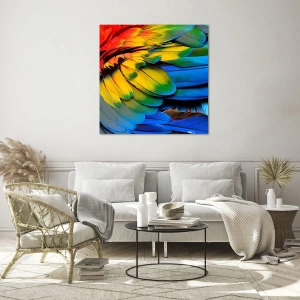 Quadro su vetro - Piume di pappagallo colorate in intensi colori arcobaleno - 50x70cm - L'uccello del paradiso - Decorazione murale moderna per soggiorno e camera da letto ARTTOR