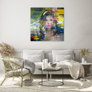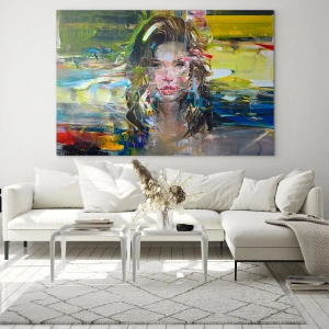 Quadro su vetro - Ritratto astratto di una donna con uno sfondo dinamico - 120x80cm - Dietro una tenda di vento - Decorazione murale moderna per soggiorno e camera da letto ARTTOR