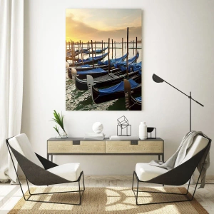 Il dipinto è realizzato su vetro e misura 70x50 cm, il che gli conferisce un aspetto moderno e un'eccezionale profondità di colore. La tecnologia di stampa su vetro consente la massima precisione nei dettagli, dai riflessi di luce sull'acqua alla texture dei pontili in legno e alle eleganti sagome delle gondole. Il riflesso esalta il senso di spazio e realismo.