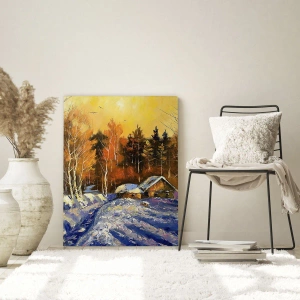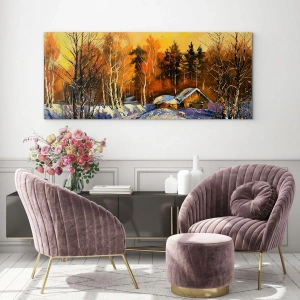 Quadro su vetro - Paesaggio invernale con una casetta di legno al tramonto - 120x80cm - Impressionismo invernale al sole - Decorazione murale moderna per soggiorno e camera da letto ARTTOR