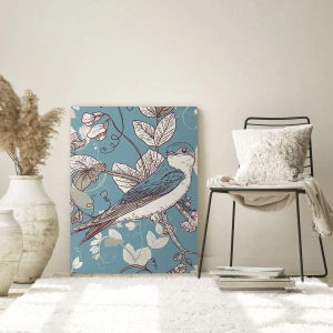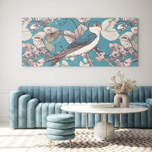 Quadro murale - Nell'albero bianco, in quarti e argentato - Uccello su un ramo tra fiori su sfondo turchese