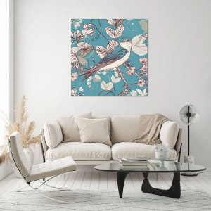 Quadro su vetro - Un uccello su un ramo tra i fiori su uno sfondo turchese - 70x50cm - Sul pioppo riflessi e cinguettii - Decorazione murale moderna per soggiorno e camera da letto ARTTOR