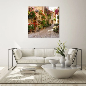 Quadro su vetro - Una pittoresca strada con fiori in vaso - 70x50cm - Un'esplosione di fiori - Decorazione murale moderna per soggiorno e camera da letto ARTTOR