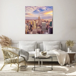 Un panorama cittadino con grattacieli illuminato dalla calda luce del sole al tramonto è una decorazione che dona modernità ed eleganza agli interni. Il dipinto su vetro 70x50 cm si distingue per la sua durevolezza e il design elegante.