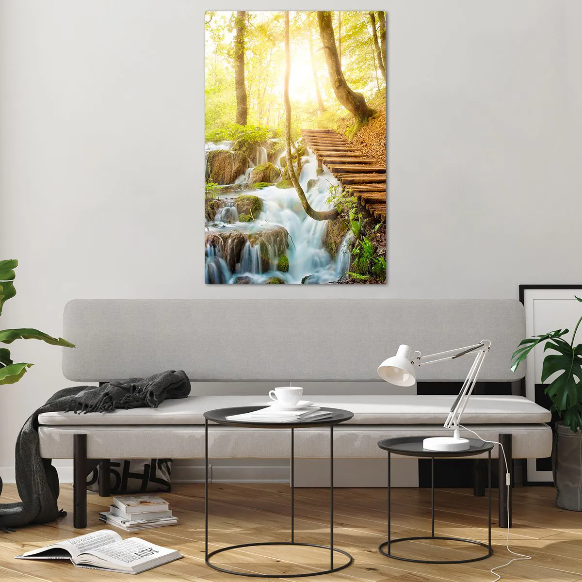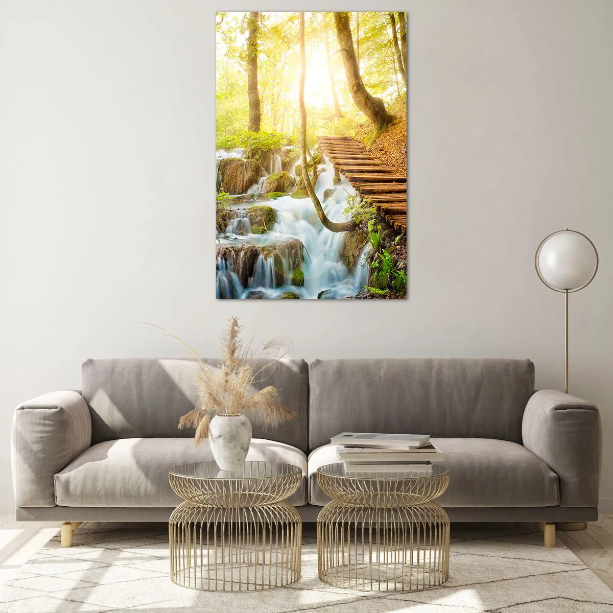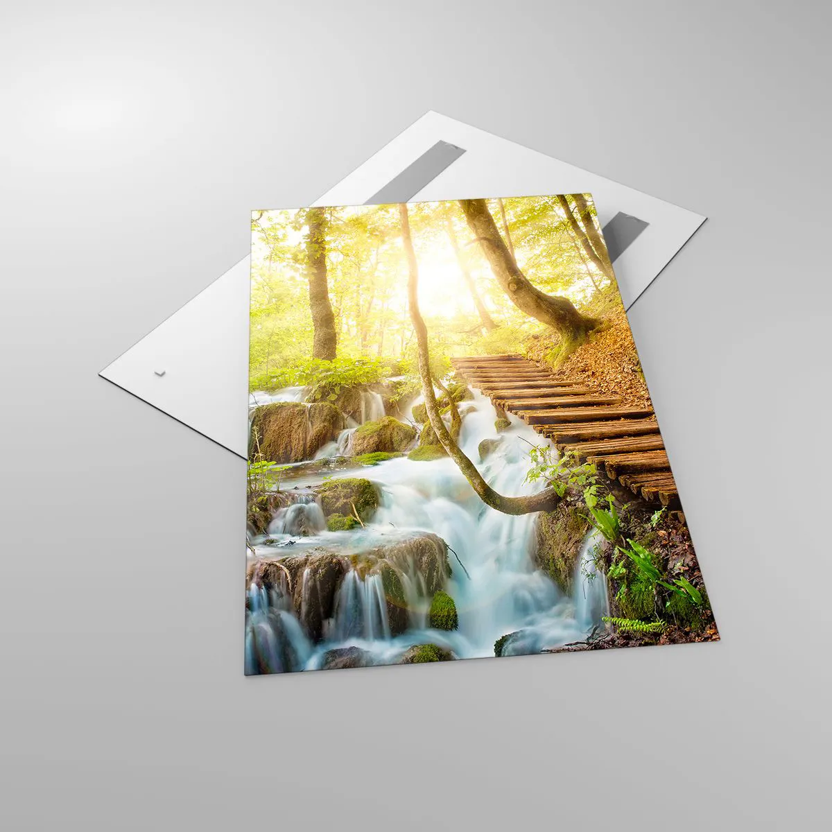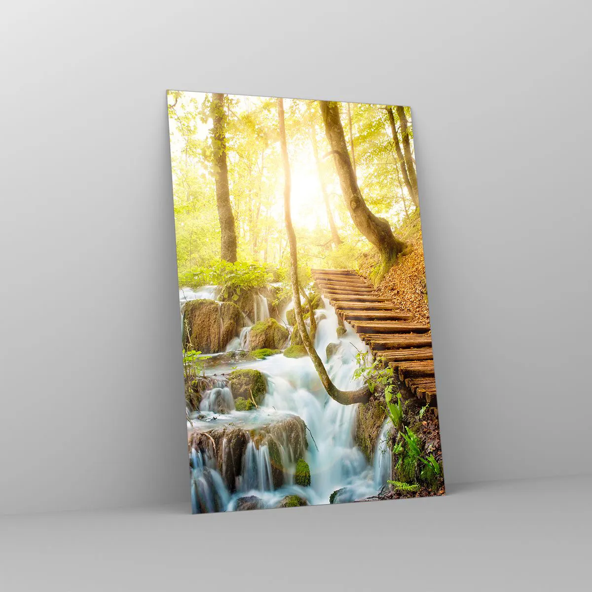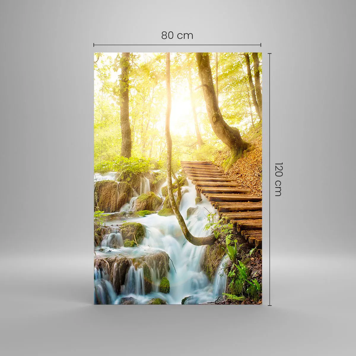Quadro su vetro - Sentiero nel bosco con scale in legno vicino alla cascata - 80x120cm - Bramata freschezza - Decorazione murale moderna per soggiorno e camera da letto ARTTOR