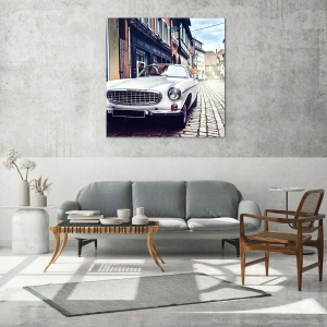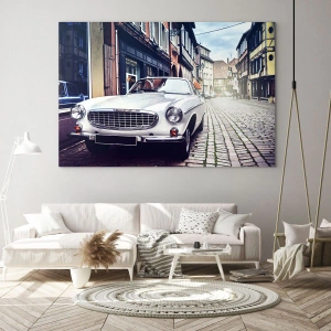 Quadro su vetro - Una classica auto bianca su una strada cittadina acciottolata - 70x100cm - Il passato è oggi - Decorazione murale moderna per soggiorno e camera da letto ARTTOR