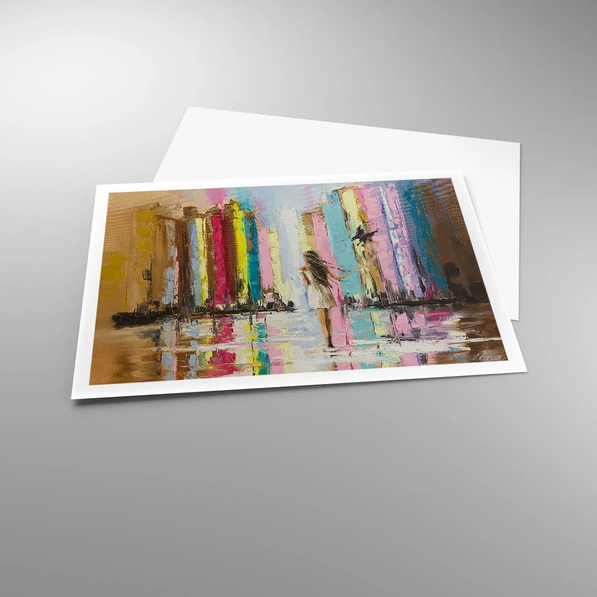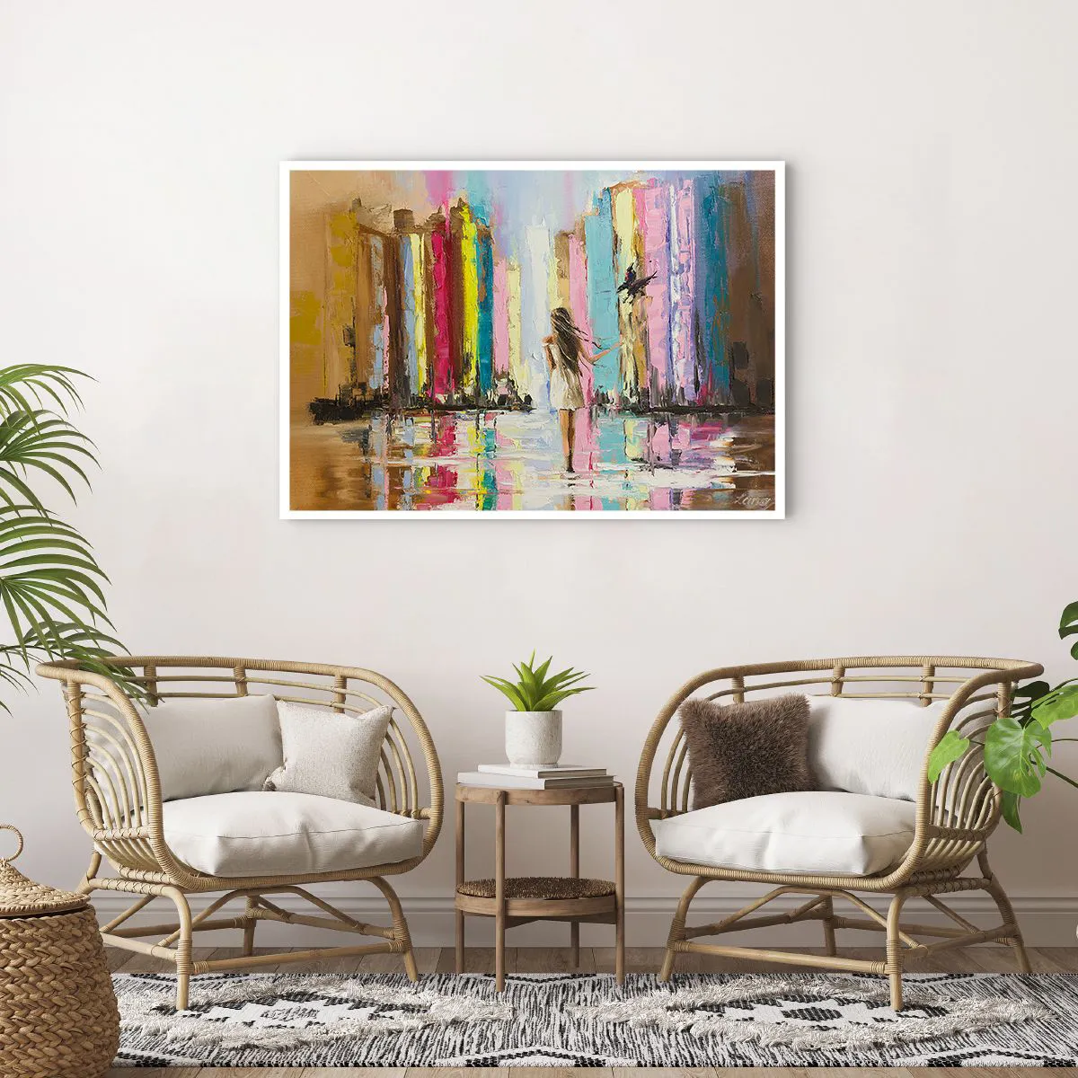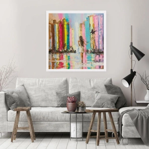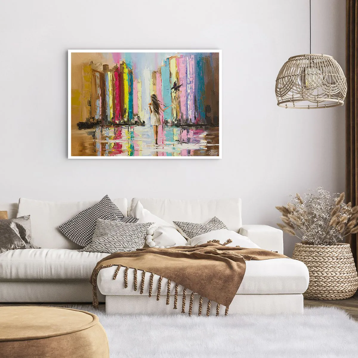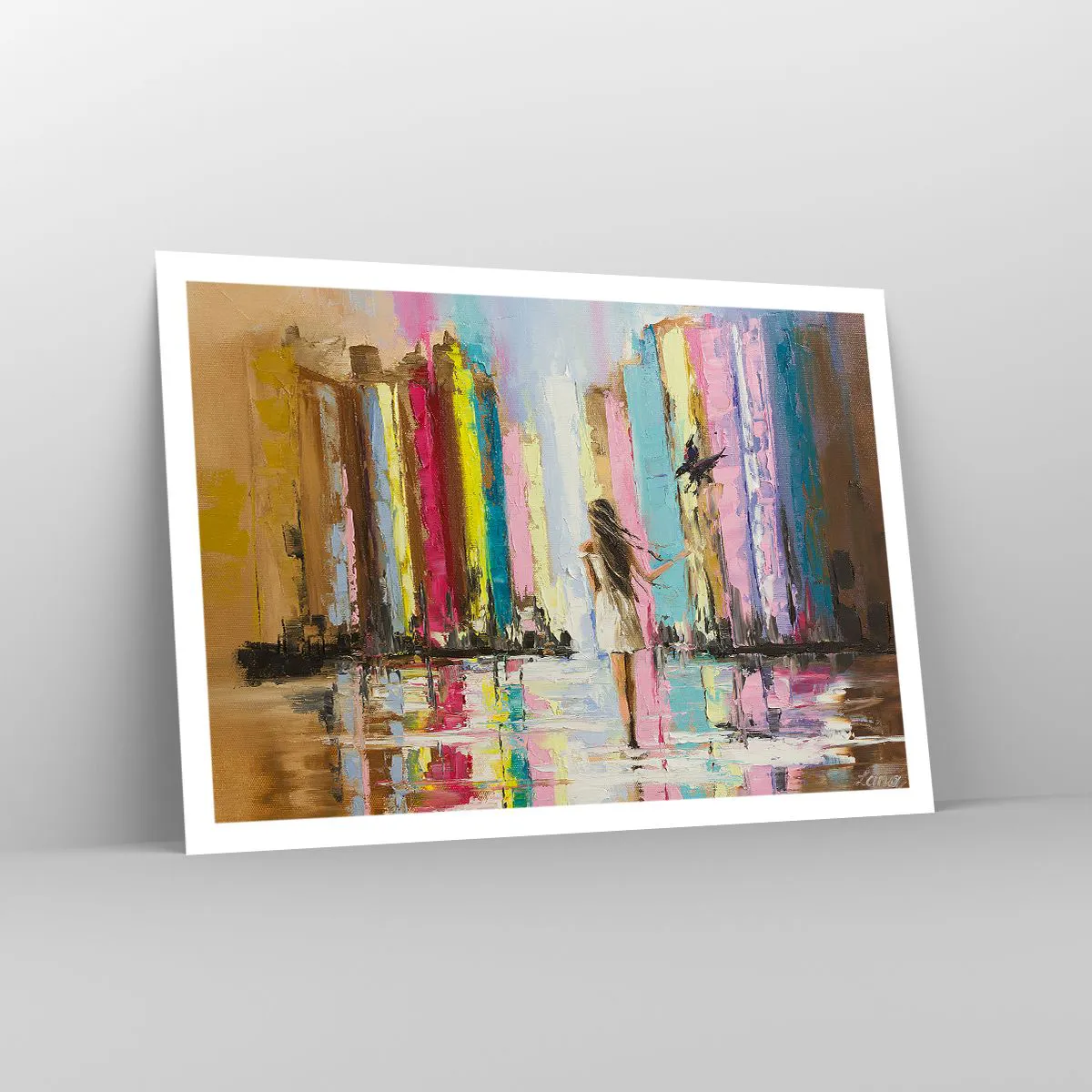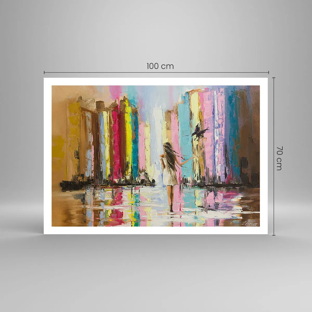 Poster - Una città colorata e una donna in abito bianco con un uccello - 100x70cm - Seguimi - Decorazione murale moderna per soggiorno e camera da letto ARTTOR