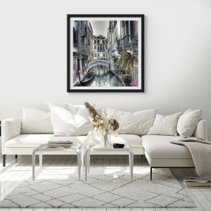 - Questo poster raffigura un pittoresco canale di Venezia, con una gondola e un ponte sullo sfondo. Perfetto per interni classici o romantici. Il poster 50x70 cm è dotato di un'elegante cornice nera.