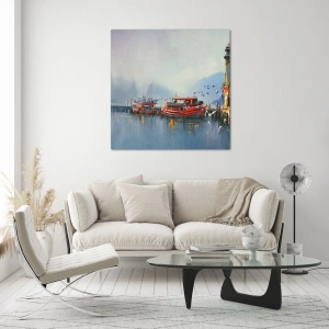 Quadro su vetro - Un porto con barche rosse, un faro e uccelli sullo sfondo delle montagne - 100x70cm - Alla fine del mondo - Decorazione murale moderna per soggiorno e camera da letto ARTTOR