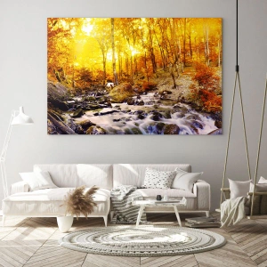 Quadro su vetro - Foresta autunnale con un fiume nei raggi di luce calda - 50x70cm - Pietre incorniciate in oro e platino - Decorazione murale moderna per soggiorno e camera da letto ARTTOR