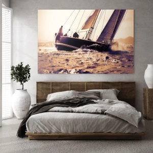 Quadro su vetro - Una barca a vela in un mare in tempesta in tonalità calde - 70x50cm - Naviga, marinaio - Decorazione murale moderna per soggiorno e camera da letto ARTTOR