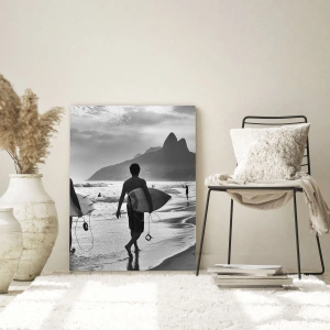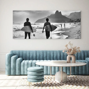 Quadro su vetro - Surfisti sulla spiaggia con tavole, composizione in bianco e nero - 50x70cm - Samba su un'unica onda - Decorazione murale moderna per soggiorno e camera da letto ARTTOR