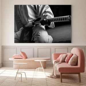 Quadro su vetro - Un samurai in kimono che impugna una katana in bianco e nero. - 80x120cm - L'anima del guerriero - Decorazione murale moderna per soggiorno e camera da letto ARTTOR