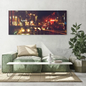 Quadro su vetro - Scena notturna della città con luci colorate e riflessi di strada - 140x50cm - Immersa nelle luci della notte - Decorazione murale moderna per soggiorno e camera da letto ARTTOR