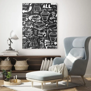• Una stampa elegante con grafica e scritte ispirate al caffè su uno sfondo nero retrò. Perfetta per bar, cucine e amanti del caffè.