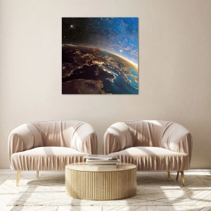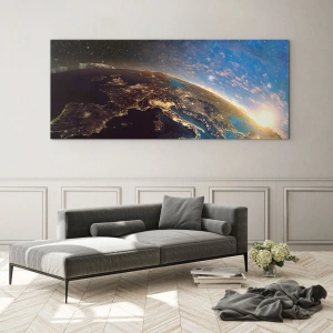 Quadro su vetro - Vista della Terra dallo spazio all'alba - 70x100cm - Guardiamoci da lontano - Decorazione murale moderna per soggiorno e camera da letto ARTTOR