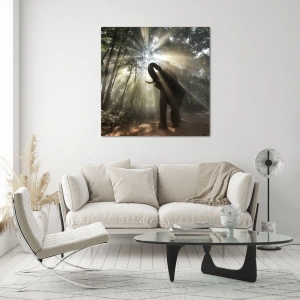 Quadro su vetro - Un elefante nella foresta circondato da raggi di luce nella nebbia mattutina - 80x120cm - Sotto una stella fortunata - Decorazione murale moderna per soggiorno e camera da letto ARTTOR