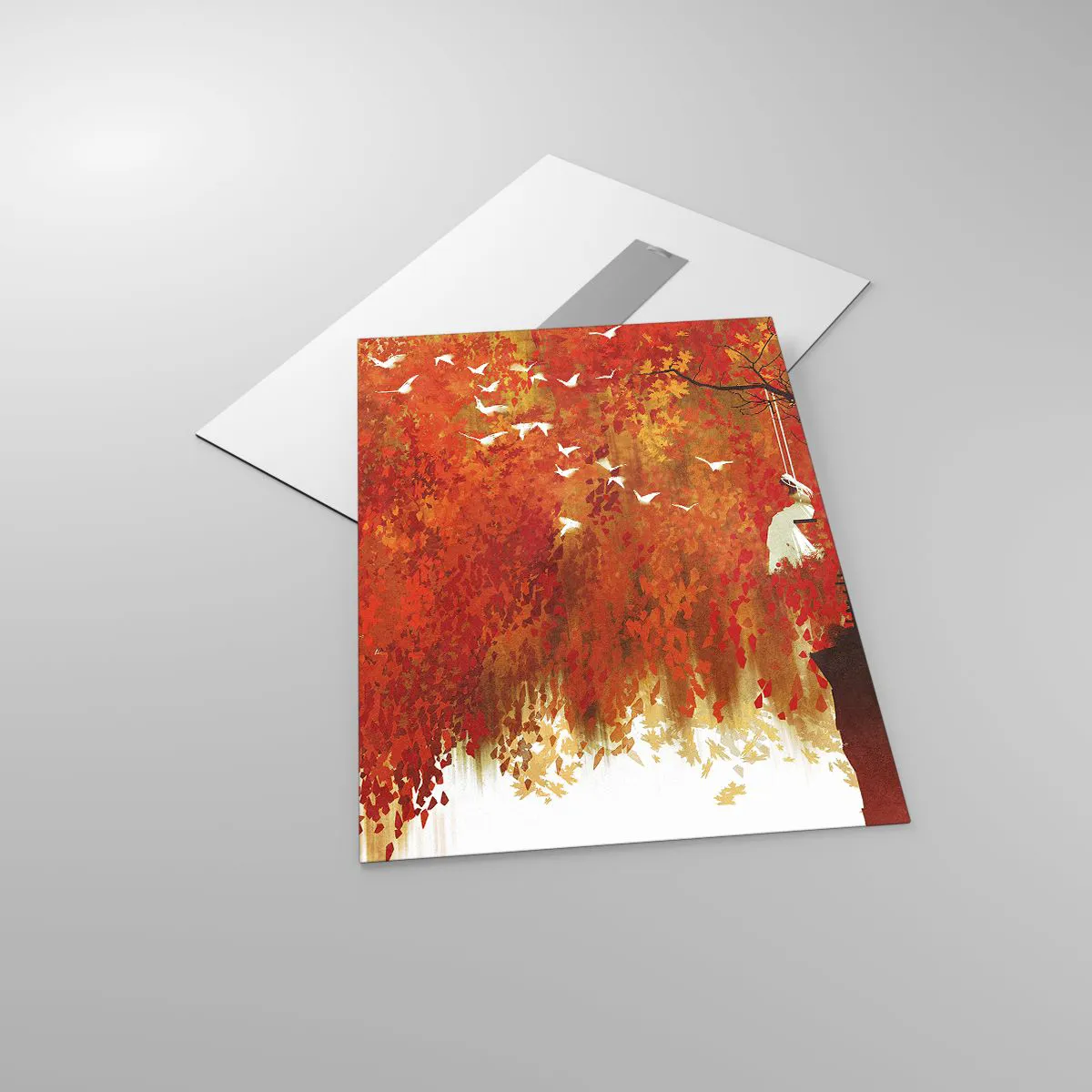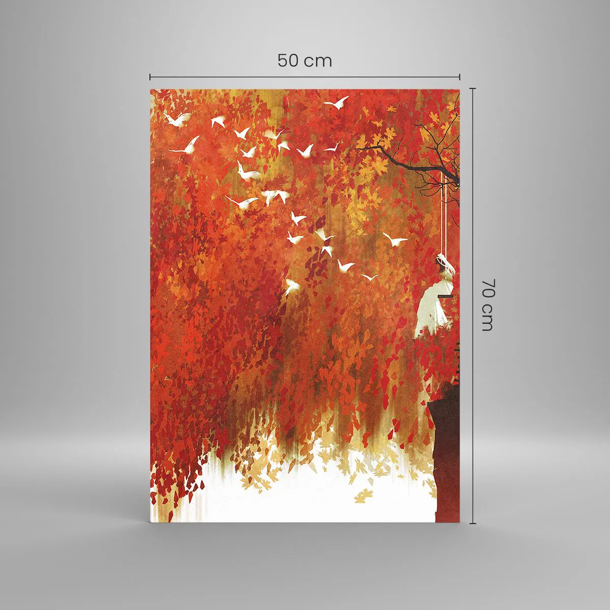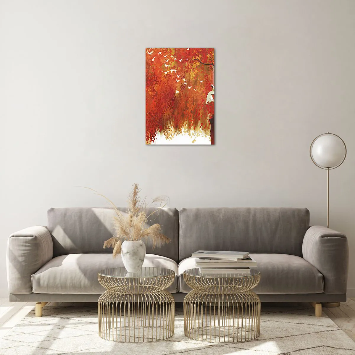 Quadro su vetro - Foglie rosse, un albero solitario e uccelli in una scena autunnale - 50x70cm - Voli con noi? - Decorazione murale moderna per soggiorno e camera da letto ARTTOR