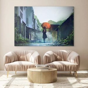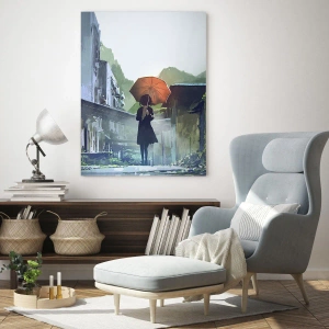 Quadro su vetro - Una figura con un ombrello in una città piovosa - 70x100cm - Pioggia vivificante - Decorazione murale moderna per soggiorno e camera da letto ARTTOR