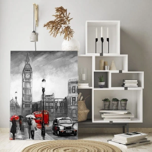 Quadro su vetro - Il Big Ben e le strade di Londra con accenti rossi su sfondo grigio - 120x80cm - Una città per niente grigia - Decorazione murale moderna per soggiorno e camera da letto ARTTOR