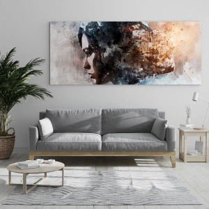 Quadro su vetro - Profilo di una donna in stile acquerello con una città sullo sfondo. - 70x50cm - Racconto su una ragazza con città sullo sfondo - Decorazione murale moderna per soggiorno e camera da letto ARTTOR