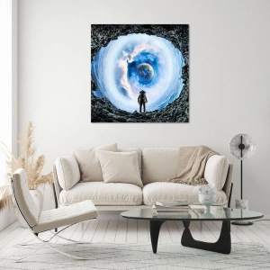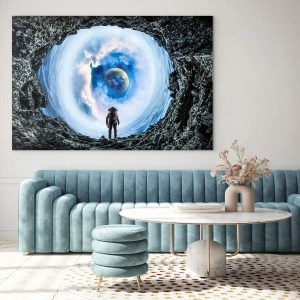 Quadro su vetro - Un astronauta osserva la Terra dall'interno di una grotta rocciosa. - 100x70cm - Già vicino a casa - Decorazione murale moderna per soggiorno e camera da letto ARTTOR
