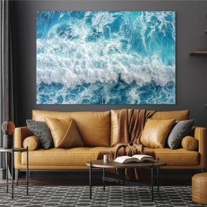 Quadro su vetro - Onde blu che si infrangono sulla riva - 50x70cm - Con gioia e saltellando - Decorazione murale moderna per soggiorno e camera da letto ARTTOR
