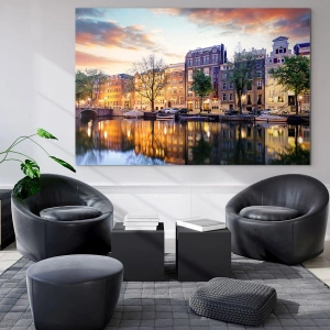 Quadro su vetro - Canale di Amsterdam al tramonto con riflesso nell'acqua - 100x70cm - Bellezza olandese riservata e tranquilla - Decorazione murale moderna per soggiorno e camera da letto ARTTOR