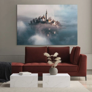 - Un'isola pittoresca con una chiesa immersa nella nebbia su un lago tranquillo. Il dipinto crea un'atmosfera di armonia e riflessione, integrandosi perfettamente in interni eleganti.